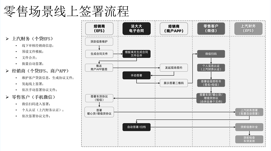 解決征信授權(quán)、車貸合同簽署合規(guī)性、真實(shí)性、意愿性要求,滿足風(fēng)控、法務(wù)要求;實(shí)現(xiàn)每年零售業(yè)務(wù)近百萬(wàn)份電子合同統(tǒng)一線上管理,提高合同簽署效率,降低管理成本,方便隨時(shí)調(diào)閱查看;滿足上汽財(cái)務(wù)輕資產(chǎn)的運(yùn)營(yíng)訴求,文件簽署環(huán)節(jié)納入線上流程,為互聯(lián)網(wǎng)汽車金融業(yè)務(wù)全線上奠定基礎(chǔ)。